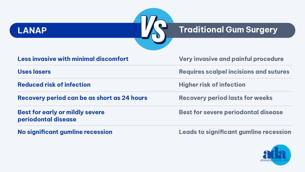 To recap, there are numerous benefits that LANAP® has over traditional gum surgery. There’s less bleeding because no scalpels or sutures are used. As a result, there’s less pain and less sensitivity to your teeth. Plus, there’s a lower risk of infection after the operation. Swelling and gum loss are also minimal.